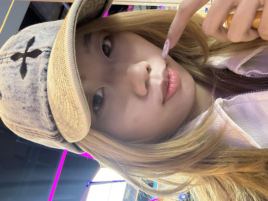 The image depicts a person, likely female, situated indoors within the Jiulongpo District, China. The subject is centered in a close-up, chest-up shot, looking directly at the camera. They wear a light-colored, possibly bleached denim baseball cap with a dark, stylized cross or asterisk symbol on the front, and a white collared jacket with a zipper, revealing a glimpse of a purple garment underneath. The individual has light brown hair, dark eyes, and light pink, glossy lips. Their right index finger, with a long, light-colored nail featuring a marbling effect, is positioned near the left corner of the mouth, subtly touching the upper lip area. A portion of an orange-brown cylindrical object is visible in the lower right quadrant, held by the subject's right hand. The background is blurred and features out-of-focus magenta and blue artificial light sources, suggesting a brightly lit commercial or entertainment environment.