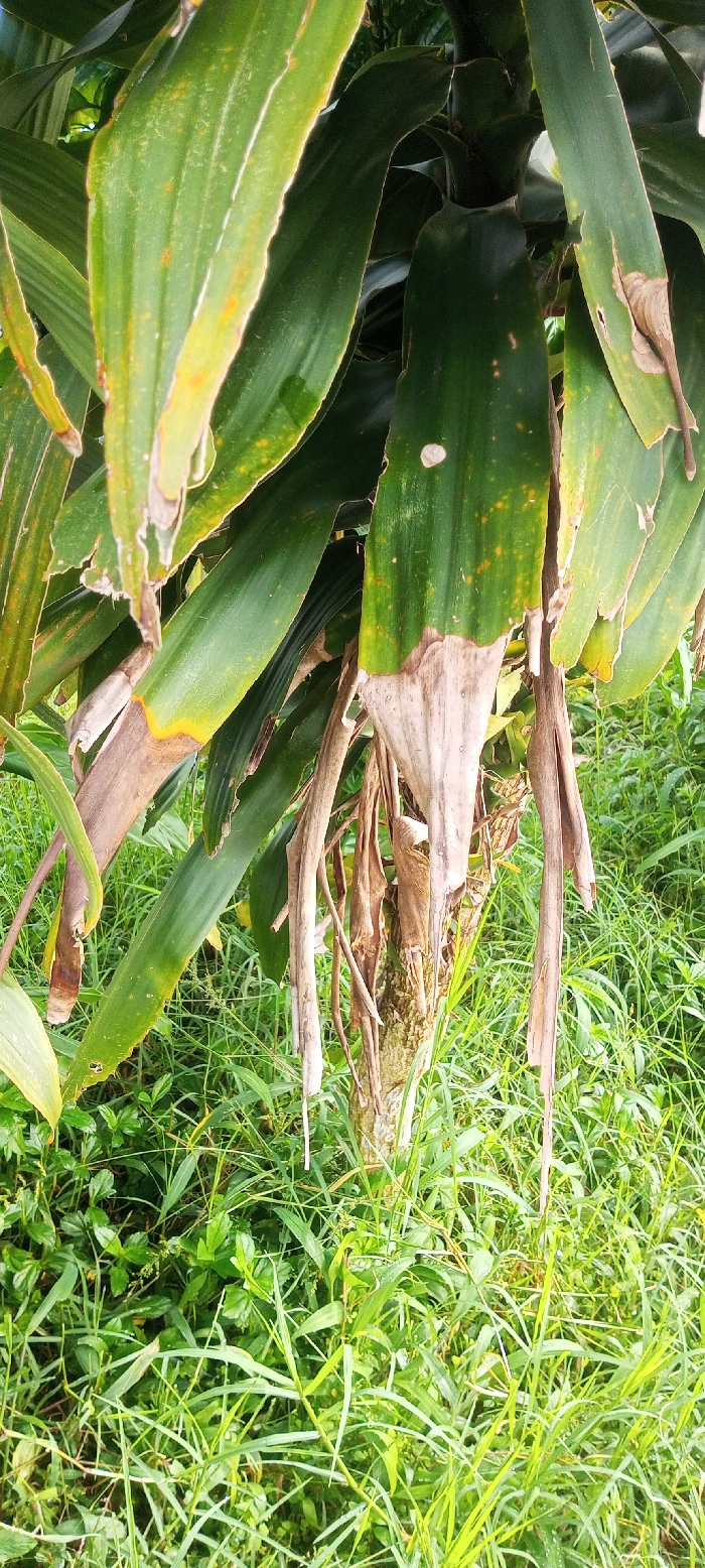 - "A vibrant green Cordyline plant dominates the image, displaying long, broad leaves with yellowing edges and brown tips indicating stress or disease" by FM-OOTcX2, licensed under CC BY 4.0