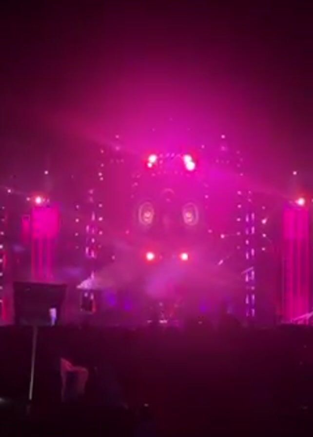 concert stage bathed in pink light. A large screen in the center is designed to resemble an owl face, with two large circles as eyes and smaller lights accentuating the features. Spotlights and other light fixtures are arranged symmetrically around the screen. The stage is crowded with performers, mostly obscured by darkness. Silhouetted figures, presumably the audience, are visible in the foreground. The overall atmosphere is energetic, illuminated by flashing lights and accompanied by loud music.