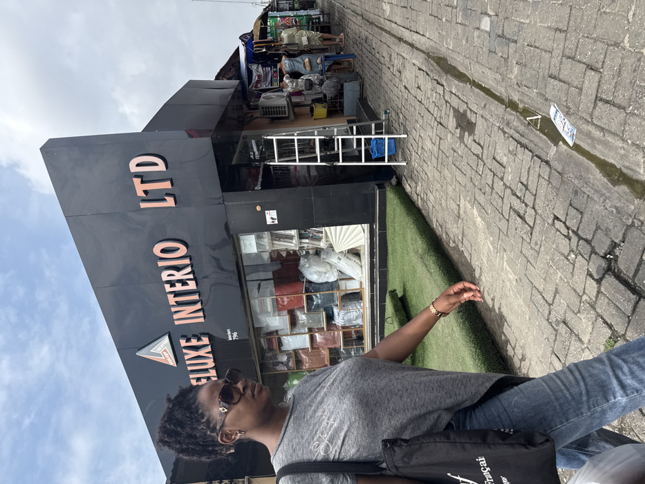 The image depicts a daytime street scene at 796 Ajah-Badore Road, Ajah, Nigeria. In the foreground, a woman of African descent walks from left to right, wearing large dark sunglasses, a grey short-sleeved top, blue jeans, and a gold-colored wristwatch on her left wrist. She carries a black tote bag on her left shoulder. Her dark hair is styled in braids or twists. The prominent structure in the midground is a commercial building with a modern, dark grey or black facade, featuring the name "DELUXE INTERIO LTD" in raised, orange-colored letters. The address "796" is visible below the name. Large display windows showcase various home furnishings and textiles. Artificial green turf lines the ground directly in front of the building's windows. To the right of the main entrance, an aluminum stepladder leans against the building, with a blue plastic bucket at its base. An air conditioning unit is mounted on the wall beside the ladder. To the right of the "DELUXE INTERIO LTD" building, a series of less structured market stalls with tarpaulin awnings are visible, displaying clothing on mannequins. Several individuals are present in this area, interacting with the stalls. The ground consists of grey interlocking concrete pavers, which appear worn and contain a narrow concrete drainage channel with standing water. Scattered debris, including a piece of paper, is visible on the pavement. The sky above is partially cloudy.