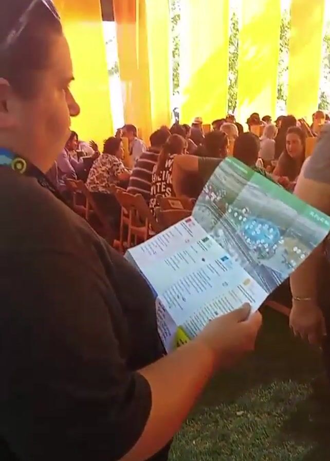 woman reading a brochure in a tent with a crowd of people seated in the background