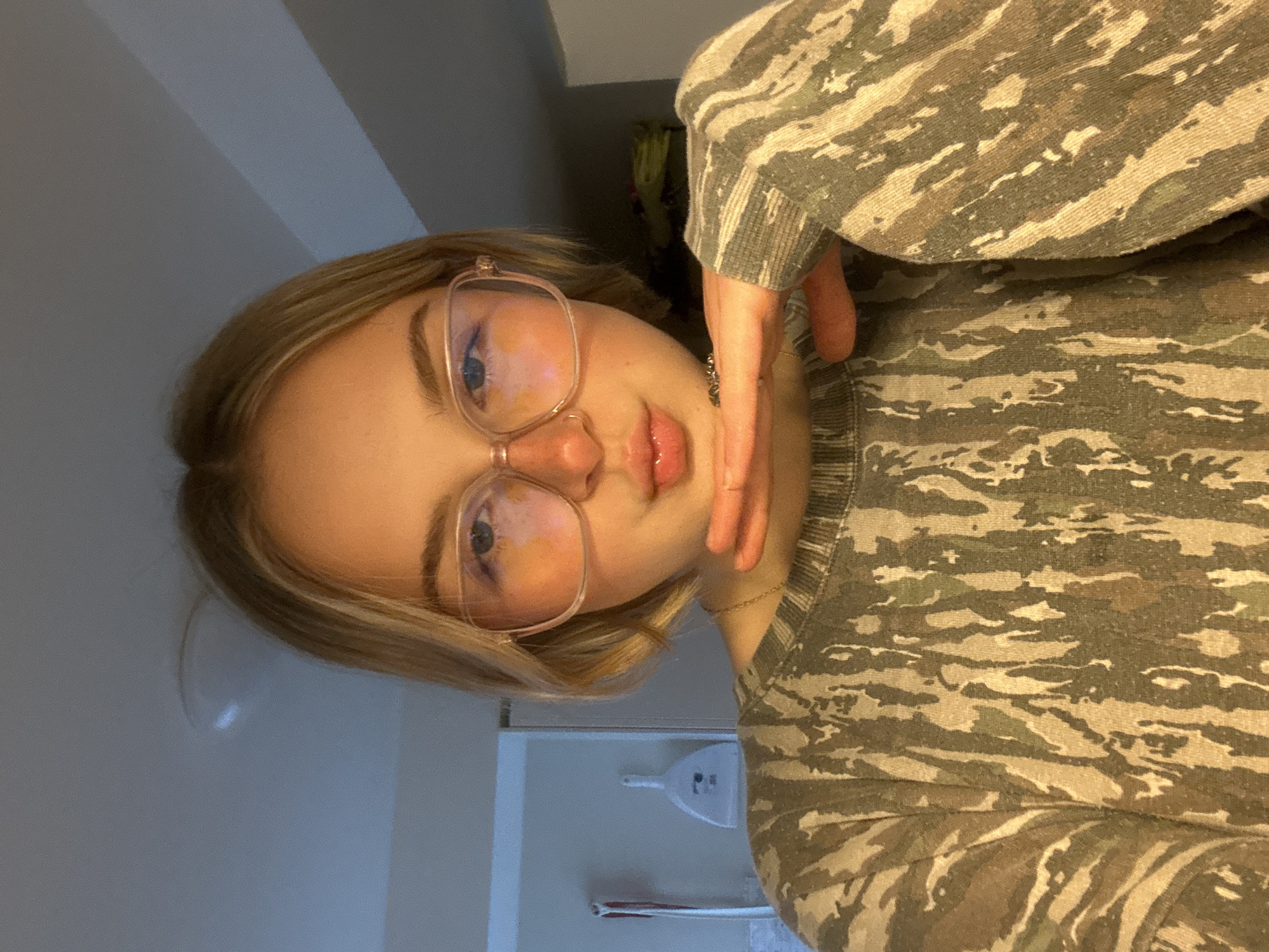 A young blonde female, approximately 18-25 years old, is depicted in a medium close-up, posing indoors in a residential setting, identified as being in Vancouver, Canada. She has shoulder-length blonde hair and wears large, clear-framed eyeglasses with a pinkish tint, behind which her blue eyes are visible. A small silver hoop piercing is present in her right nostril. Her lips are pursed in a "kissy face" expression, with a noticeable shine. She wears a long-sleeved, crew-neck sweater with a multi-toned camouflage pattern in shades of olive green, brown, and light beige. Her left hand is positioned flat beneath her chin, with a ring visible on her left ring finger. A thin gold chain necklace is also visible. The background consists of a plain, light-colored wall. To the left of the subject, a white dustpan hangs on the wall, partially obscuring a red-handled object, likely a broom. Overhead artificial lighting illuminates the scene, casting a light blue hue on the visible ceiling.