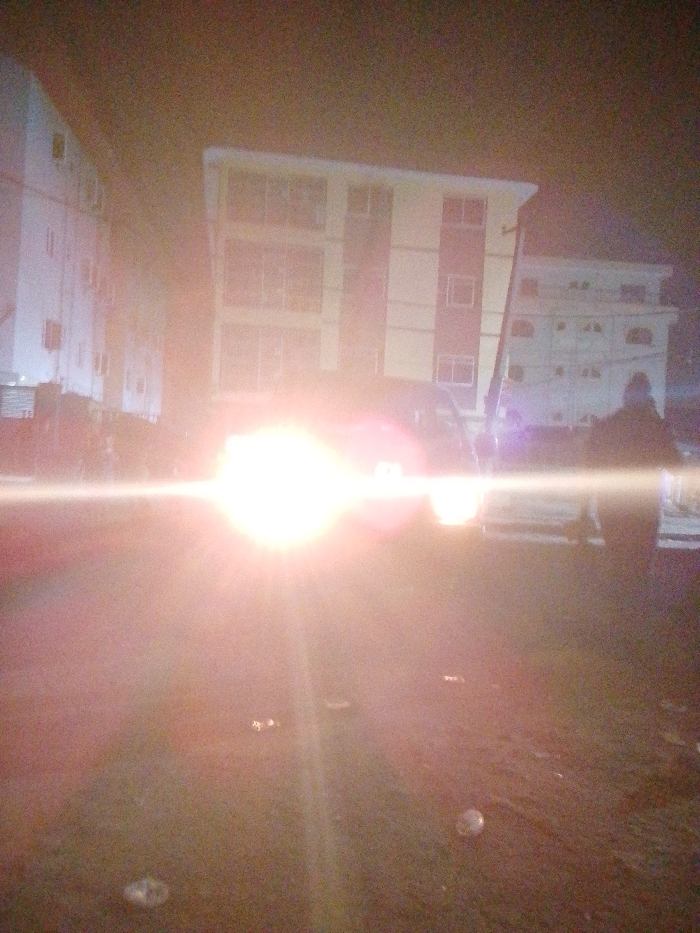 At night, a bright light obscures the view of a road. Building structures are dimly visible in the background with several windows. A car with its headlights is parked on the road. A silhouette of a person is visible on the right. Debris is scattered on the road. The overall scene appears hazy.