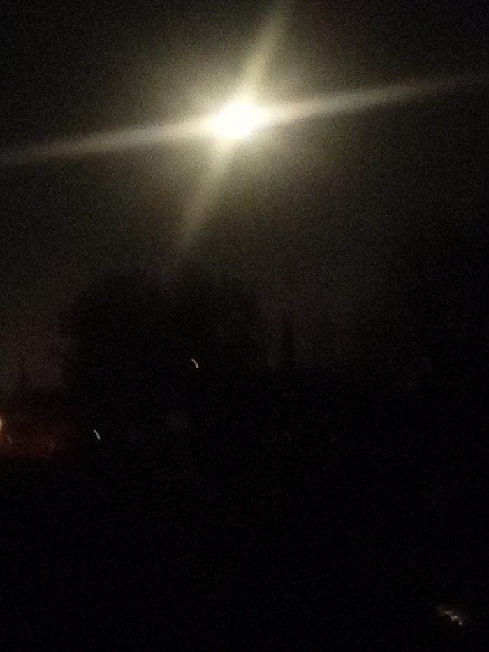 The image depicts an outdoor nighttime scene within the city of Los Angeles, United States of America. A brilliant, highly diffused white light source, exhibiting a prominent cross-shaped lens flare, occupies the upper-center of the frame, suggesting a powerful artificial light or the moon obscured by atmospheric haze or fog. The environment below this light is predominantly dark, revealing only indistinct, silhouetted forms consistent with trees and distant urban structures. In the lower-left quadrant, a faint, warm-toned diffuse light source or reflection is present. Two small, curved, elongated white light streaks are discernible in the mid-ground against the dark backdrop, possibly reflections or distant, blurred light points. No individuals, specific actions, or interactions are identifiable. Precise location within Los Angeles cannot be determined from the visual information provided.