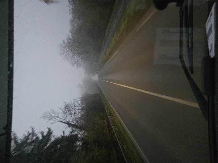 A misty road stretches ahead, bisected by a solid yellow line. Trees line both sides, fading into the fog. The scene is viewed from inside a vehicle, with parts of the window, windshield wiper, and dashboard visible on the sides of the frame. The image has a hazy and slightly tilted perspective, creating a sense of atmospheric depth and potential uncertainty. The lighting is subdued, likely due to the fog and overcast conditions.