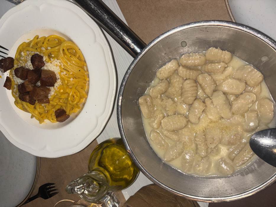 The image displays a dining table setting from a high-angle perspective, featuring two prepared food dishes and condiments. A white, scalloped-rimmed plate centrally holds a serving of yellow spaghetti-like pasta, topped with approximately ten prominent, irregularly cubed pieces of well-browned meat, consistent with guanciale or pancetta, and a generous dusting of white grated cheese. To the left of this plate, a clear glass cruet filled with olive oil is visible, alongside a partially obscured clear drinking glass and a black plastic fork resting on a light brown surface. Below the pasta plate, a round, silver-colored metal pan contains numerous light-colored gnocchi immersed in a creamy white sauce, also garnished with white grated cheese. A silver spoon is partially visible within the gnocchi pan. The immediate surface beneath the dishes is a light brown, fibrous material, possibly paper. The specific location within the city of Miami, United States of America, is not discernible from the provided visual evidence.