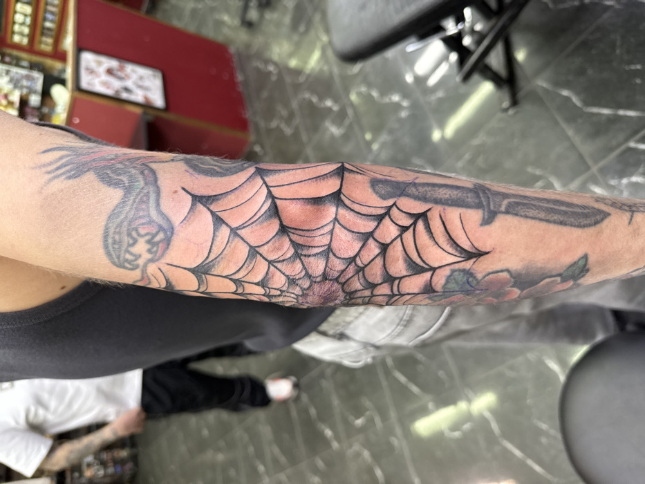 The scene depicts a medium shot inside a commercial establishment, identified as being in the city of Moscow, Russia, consistent with a tattoo studio. The primary subject is the right arm of an individual, likely male, positioned prominently in the foreground. This arm displays extensive tattooing, including a black and grey spiderweb design centered on the elbow, exhibiting a reddish, raised area at its core indicative of a recent tattoo. Above the web, on the upper arm, is a tattoo of a snake's head with an open mouth and fangs. Below the web, on the forearm, a dark dagger tattoo points downwards, accompanied by blurred floral designs. The individual's torso is partially visible, wearing a dark grey sleeveless top and light grey denim jeans. In the blurred background, another individual stands, wearing a white t-shirt, dark pants, and white sneakers with pink accents, also showing visible arm tattoos. The environment includes a reflective dark tiled floor with light veining, a red counter or cabinet in the right background, and a framed display of multiple small designs on a wall. A black metal stool with a dark cushion is partially visible in the lower right.