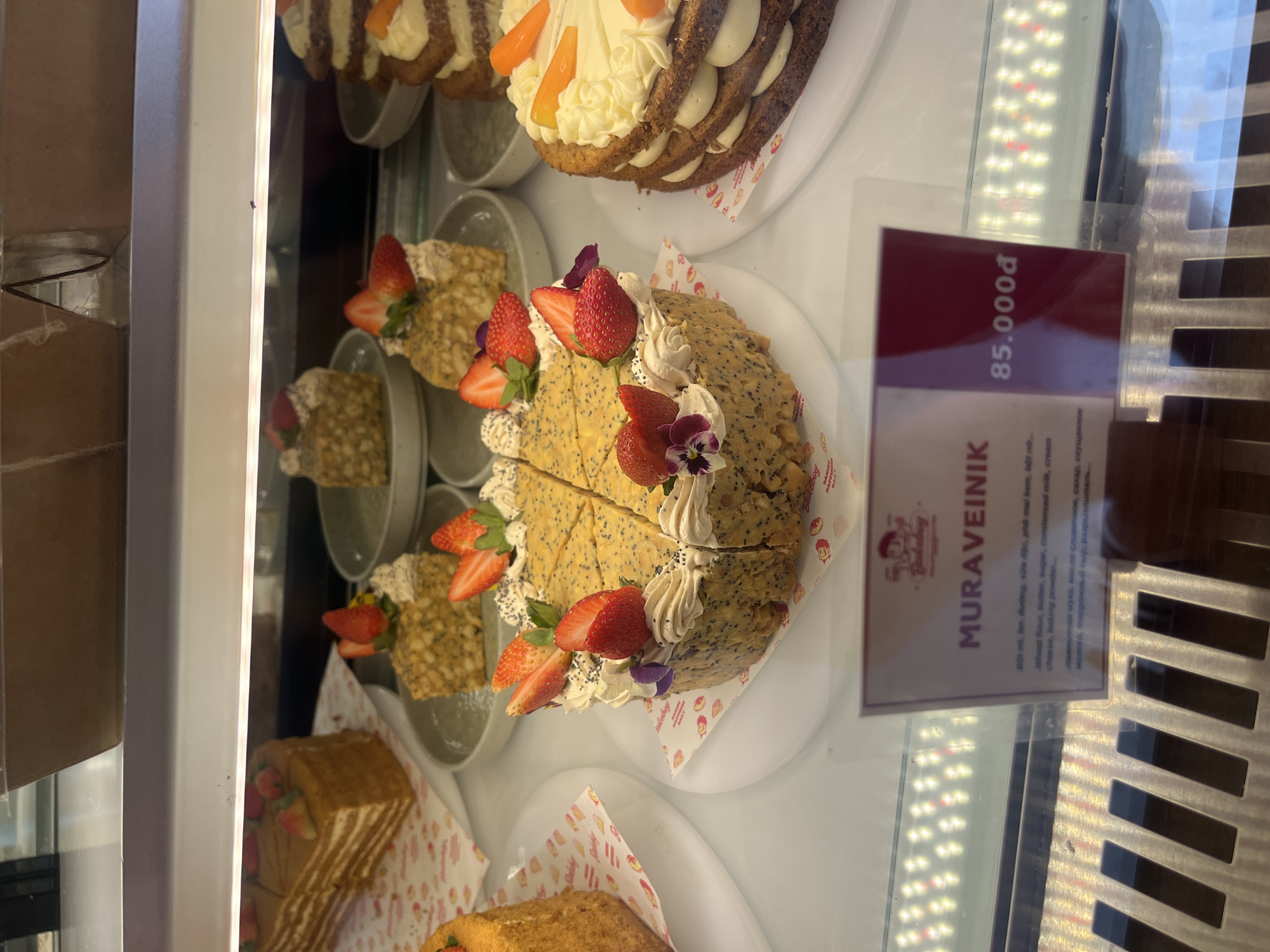display case filled with various cakes, potentially in a bakery or cafe in Bắc Nha Trang, Vietnam. In the foreground, a cake labeled "MURAVEINIK" is displayed with a price tag of 85,000₫. The cake is decorated with strawberries and flowers. The label provides ingredient information, listing wheat flour, butter, sugar, condensed milk, cream cheese, and baking powder in both Vietnamese and Russian. Additional cakes are visible in the background. The display case appears to be made of glass and metal.