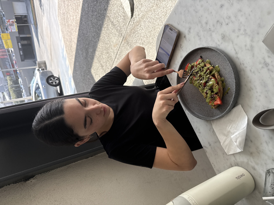- "A woman in a black top sits at a marble table, using a fork to cut into a dessert on a gray plate" by FM-6aVsN2, licensed under CC BY 4.0