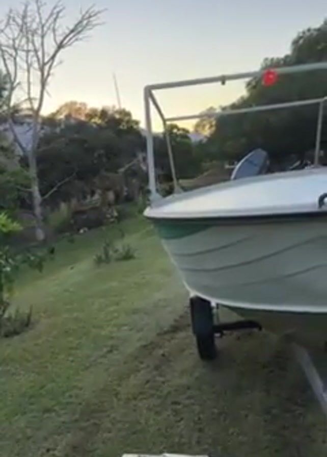 The camera is mounted on the back of a vehicle, likely a truck. The vehicle is parked on a grassy lawn. A boat on a trailer is visible to the right. The boat is white with a green stripe. It has a metal frame structure on top. In the background there are trees and mountains visible under a light blue sky. The time of day appears to be early morning or late afternoon.