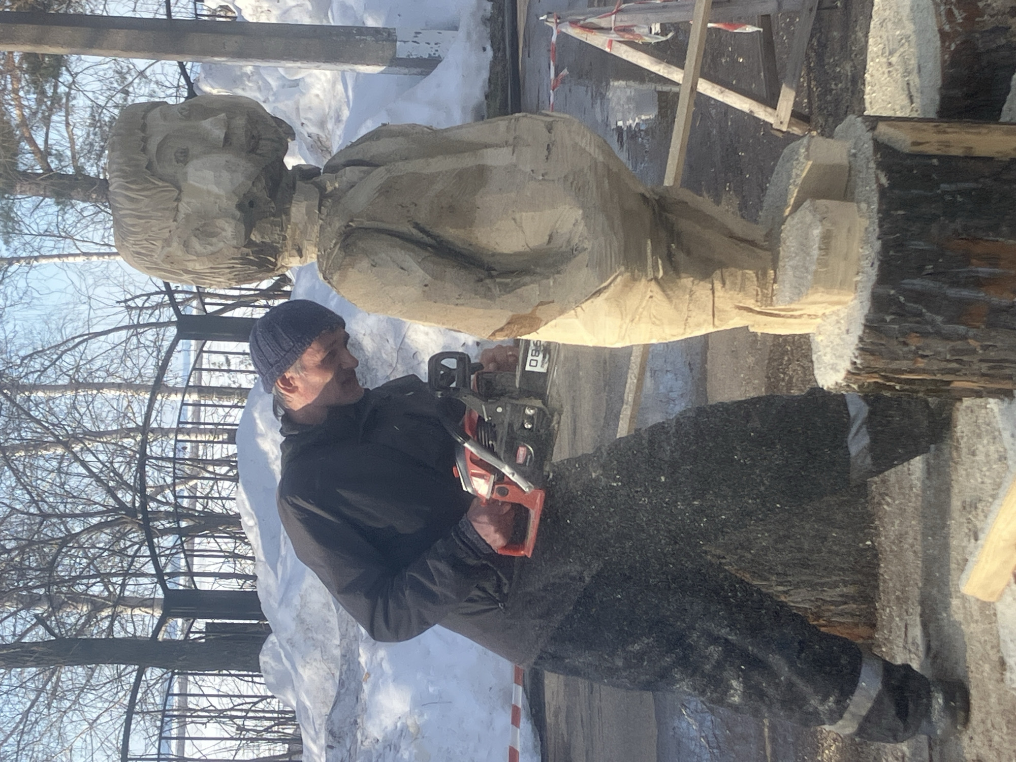 A man in a dark blue knit cap and dark clothing uses a chainsaw to carve a wooden sculpture in an outdoor setting. The sculpture, already partially formed, depicts a human figure. The scene is located in Chaikovsky, Russia. Snow is visible on the ground, and bare trees are in the background. A red and white barrier is also visible. The sculpture is mounted on a large log. Sawdust is present on the man's clothing and the ground.