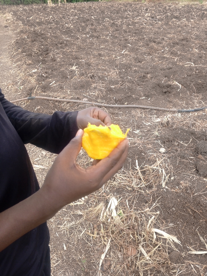 The image depicts a person's hands holding a partially eaten bright yellow fruit within an agricultural field in Kariguni, Kenya