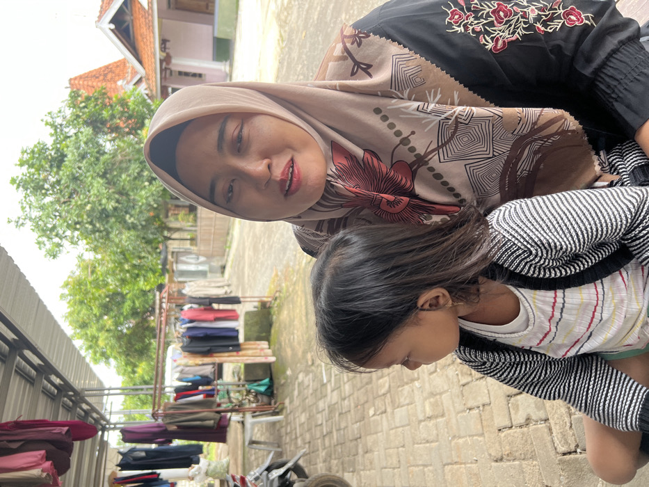 In Wedarijaksa, Indonesia, a woman and a young child are positioned under a corrugated metal lean-to structure
