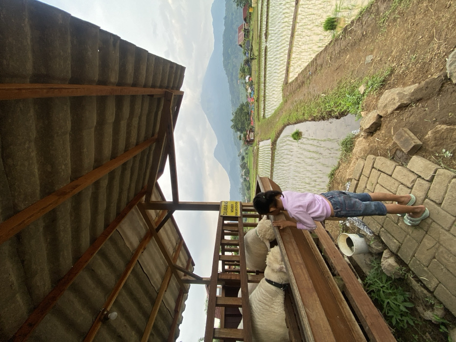 The image depicts an agricultural scene in Selotapak, Indonesia, under an overcast sky. In the foreground, a young girl, seen from the rear, wears a light purple long-sleeved top, denim shorts, and light blue flip-flops. She stands on a light brown brick-paved surface, leaning against a wooden feeding trough. Inside a wooden enclosure to her left, two large, white, woolly sheep are visible with their heads lowered into the trough, seemingly feeding; one sheep has a black collar. A white bucket rests on the ground near the trough. A yellow sign with black text, "DILARANG MEMBERI MAKAN DOMBA" (DO NOT FEED SHEEP), is affixed to the wooden structure above the trough. The enclosure is covered by a grey corrugated roof supported by wooden beams, from which a single light bulb hangs. To the right, a narrow dirt path runs adjacent to a water-filled irrigation ditch, bordering multiple flooded rice paddies containing young green rice plants. In the background, a prominent blue-grey mountain range rises under a cloudy sky, with scattered buildings and green foliage visible between the rice paddies and the mountains.