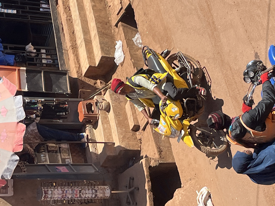 The image depicts a street scene in Labé, Guinea, under bright sunlight, characterized by earthen tones and commercial activity. In the foreground, two individuals are partially visible on a blue motorcycle, facing right. The driver wears a dark jacket, an orange vest, red gloves, and a multi-striped knit hat. The passenger behind wears a blue head covering (hijab) and blue clothing, looking to the viewer's left. In the midground, a person on a bright yellow motorcycle travels from left to right across the frame. This individual wears a light-colored long-sleeved shirt, a yellow safety vest, dark pants, and red sandals, along with a red headwrap and a black backpack. The motorcycle is predominantly yellow with black trim and a chrome footrest. The road surface is unpaved, reddish-brown dirt, showing clear tire tracks. The background features a multi-tiered building with reddish-brown earthen steps leading up to a doorway. An individual in blue jeans and a patterned shirt is partially visible inside the doorway, leaning forward, engaged with items on shelves. An open, orange and white striped umbrella shades the entrance. To the left of the doorway, a tall, rotating display stand holds multiple pairs of eyeglasses or sunglasses. On the steps, a small brown plastic stool and a dark metal kettle are present. Further to the right, another building entrance or window is visible, with blue fabric hanging. White plastic bags are scattered on the ground near the steps. To the far left, an earthen bank with a dark opening is present. Strong shadows are cast across the scene, indicating clear weather.