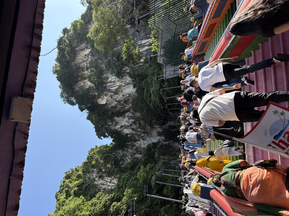 A crowd ascends vibrant, multicolored steps near a rocky cliff face densely covered in green foliage under a clear blue sky