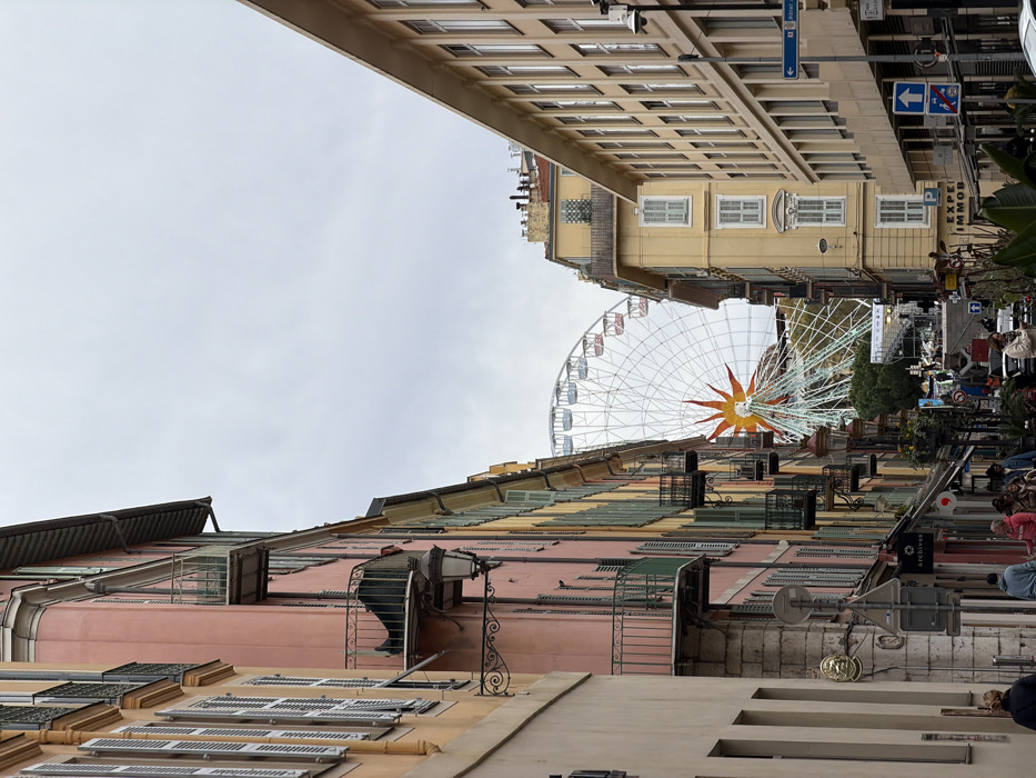 This image depicts an urban street scene in Nice, France, looking eastward towards the Place Masséna area where a Ferris wheel is located