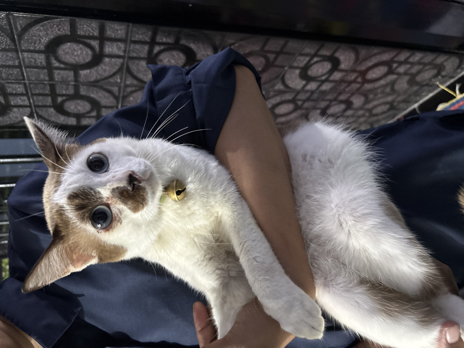 A white-and-light-brown bi-color cat with large, round, light blue eyes and a small brass bell on a light green collar is being held by a person in Kebonsari, Indonesia