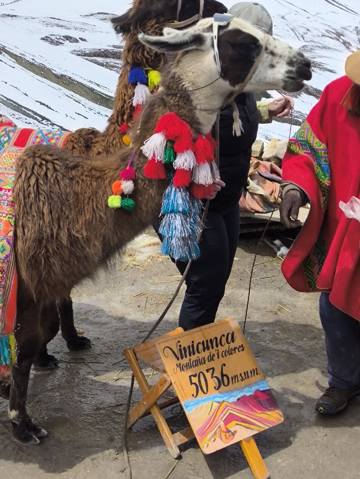 - "Two llamas stand near a sign that reads "Vinicunca Montana de 7 colores 5036 msnm" by FM-tC1362, licensed under CC BY 4.0