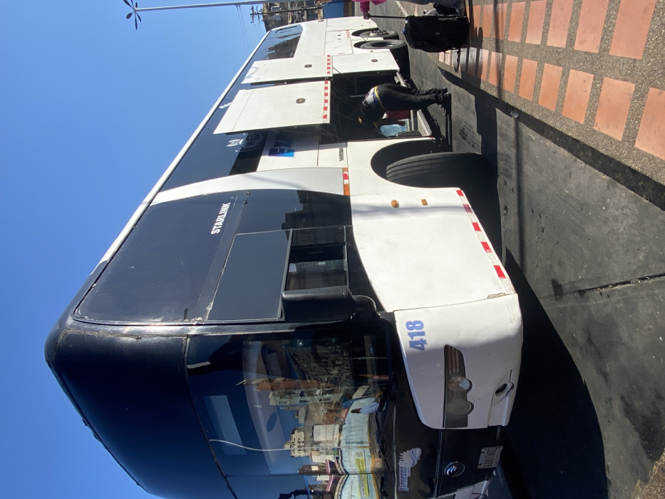 A large Starlink bus, numbered 418, is parked on a street with luggage loaded