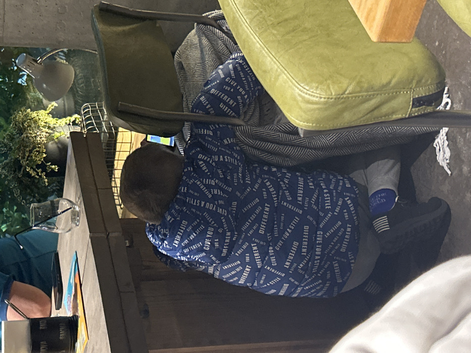 This image captures a scene within an interior or covered exterior space in Slobozhanske, Ukraine, likely a cafe or restaurant. A single individual, viewed from behind, kneels or squats on a dark floor in the center-right of the frame. This person wears a blue puffer jacket uniformly patterned with white text that reads "DIFFERENT" and "GIVE YOU A STYLE." They are engaged with a brightly lit screen, likely a mobile device, held low and out of direct view, casting a visible blue and yellow light reflection. The person's lower body is clad in grey trousers, revealing a blue sock with white horizontal stripes on the visible right leg, along with a dark, textured shoe or slipper. To the immediate right of the kneeling person is the upper portion of an olive-green leather armchair, exhibiting visible stitching and a dark zipper along its rear edge. A grey blanket with a diagonal striped pattern is draped over an unseen chair or object behind the kneeling individual. In the upper left quadrant, a segment of a dark wooden or composite table is visible. Upon this table rests a dark cylindrical container with white text, a clear glass with a dark, angled straw, and several colorful, flat rectangular items. A person's arm, dressed in a light blue sleeve, is partially visible behind the table. The background features multiple potted green plants, some illuminated by a light source, suggesting an indoor garden or patio ambiance. A small, light-colored, adjustable desk lamp is also visible in the background. The floor surface appears dark, possibly concrete, and a small, white piece of debris or fabric lies near the base of the olive-green armchair.