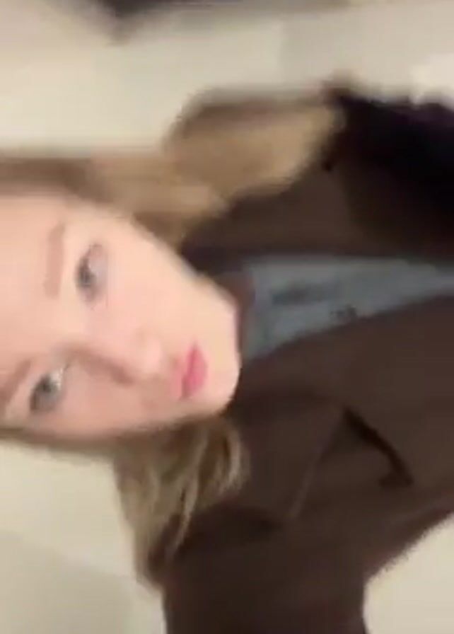 young woman with blonde hair and light eyes, wearing a brown coat over a gray shirt. She appears to be holding a white plastic bag and gives the camera a kissy face. The background consists of a white wall and what appears to be a dark-colored object. The camera's perspective suggests it's held at a slight angle, looking up at the woman.