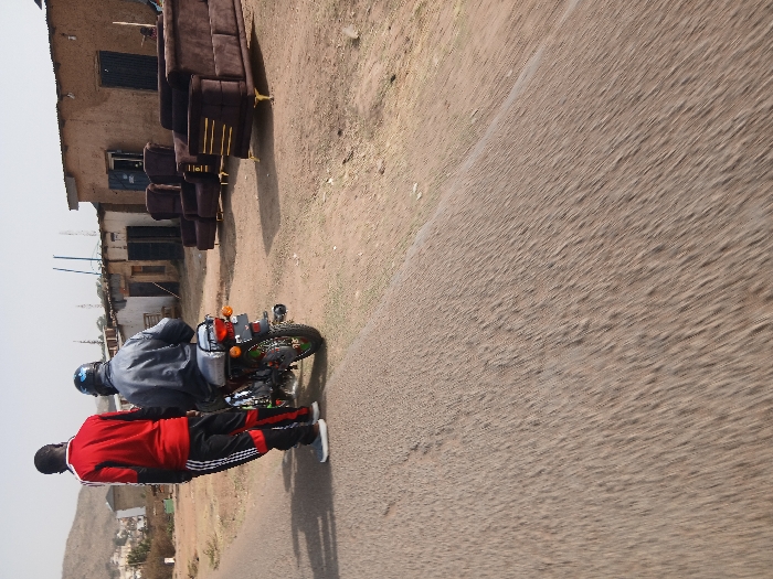 A motorcycle carries two people down a road. One person wears a red and black tracksuit while the other wears a grey jacket and blue helmet. The road stretches to the right of the frame. A building and furniture sit on the left side of the road. A distant mountain is visible in the lower left corner. The image has been rotated, positioning the road diagonally.