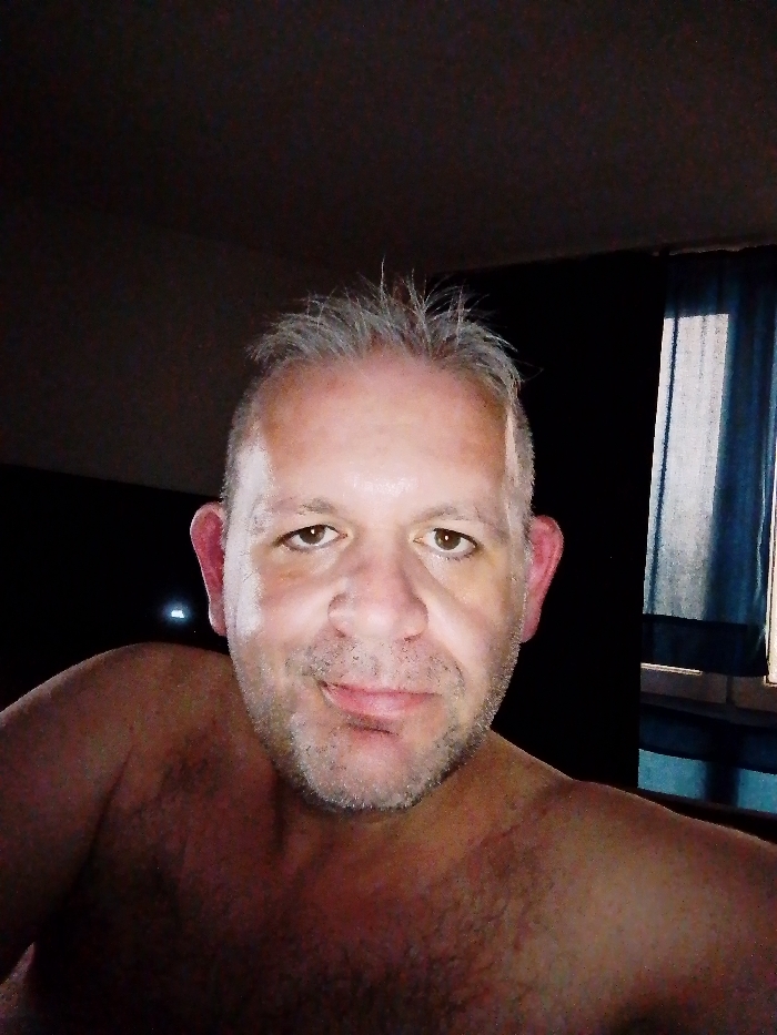 The scene depicts an adult male in an indoor setting in Dortmund, Germany. The man is positioned centrally, facing directly towards the camera, with his head and upper torso visible. He has short, spiky, grey hair and a short, grey beard. His eyes are brown, and he exhibits a subtle, ambiguous expression with a slight smirk or hint of a smile, with the left side of his mouth slightly downturned. He appears shirtless, exposing his chest and shoulders, which have visible body hair. The background is dimly lit, featuring dark walls or ceiling on the left side. To the right, a window is partially visible, covered by semi-translucent blue or teal curtains that allow some light to penetrate. A light-colored window frame is discernible behind the curtains. A faint, diffuse light source is present in the far left background, suggesting a possible electronic screen or light from an adjacent area.