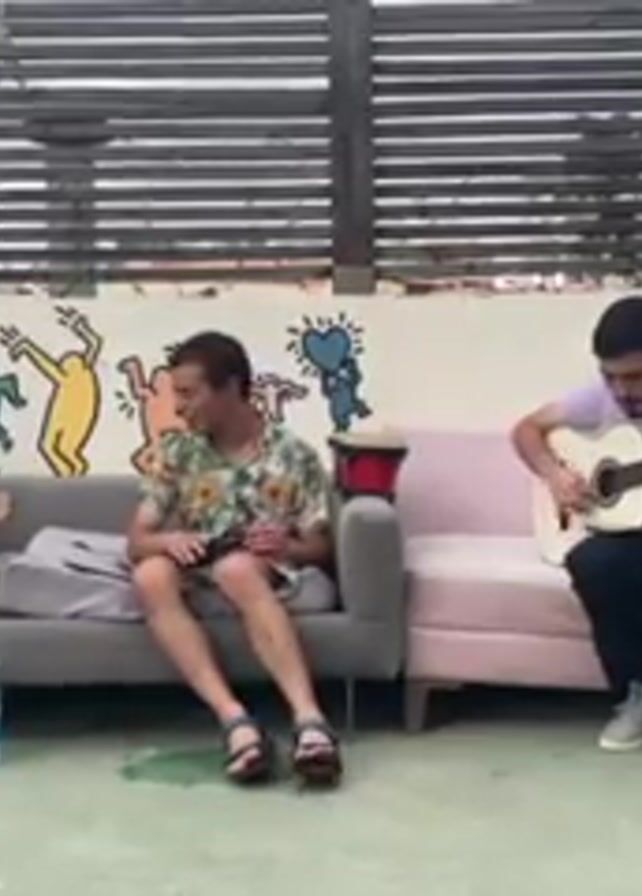Four young men are on a rooftop, three sitting on couches and one partially visible on the left. Two of the men are playing guitars, one is playing a small percussive instrument, and the fourth is looking at his phone. The roof has a wooden trellis-like structure above and a wall with Keith Haring-style figures painted on it. There is also a water bottle and a small drum visible. Everyone is casually dressed in summer clothing.