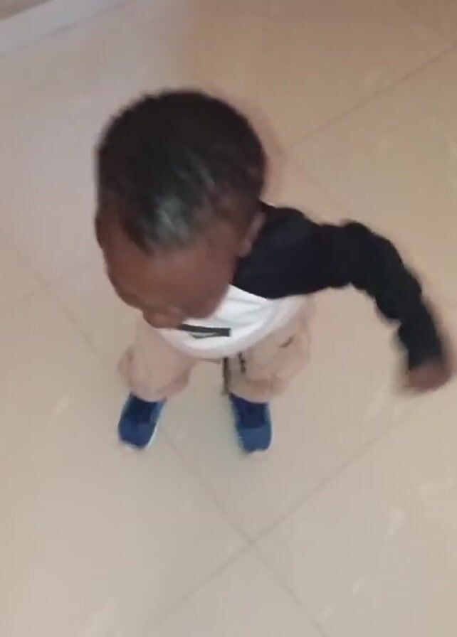 A young child with dark skin and a close-cropped haircut stands on a tiled floor