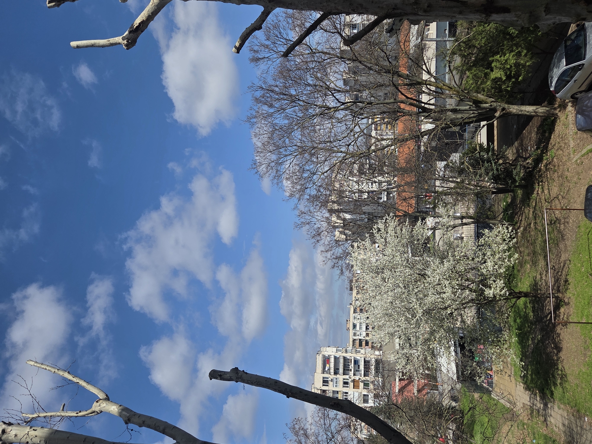 A downward-angle shot shows a cityscape scene from what is likely an apartment building balcony. In the foreground and background, there are multiple bare branches of trees, some obscuring parts of the scene. The sky dominates the left side of the frame, showing a brilliant blue with puffy white clouds scattered across the expanse. The right side of the frame is dominated by buildings, trees, and greenery. Multiple apartment buildings with varying designs are visible. Some have red-tiled roofs. A tree with full white blossoms is prominent in the midground. Below the buildings and trees is a green area, possibly a park or courtyard. The composition suggests the shot was taken during the day, under clear, sunny weather. Based on the buildings and landscape, the location is likely an urban residential area in Pleven, Bulgaria. There are cars parked near the trees.