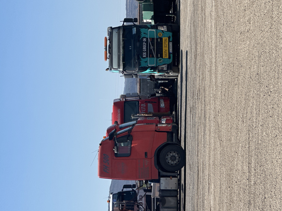 An outdoor scene in Slivnitsa, Bulgaria, depicts a gravel or dirt parking lot under a clear blue sky. Several heavy goods vehicle (HGV) cabs are stationary in the lot. In the mid-ground, a red Volvo FH 500 semi-truck cab is positioned, oriented towards the right. Partially visible behind it is another red semi-truck cab displaying the words "Premium" and "3 LTD." To the right of the red trucks, a black and teal Volvo semi-truck cab is parked, facing forward. Its front features "NIK GROUP 08," a yellow rectangular sign reading "TRANSPORT EXCEPTIONAL," and a Bulgarian license plate "CO 4444 AH." Amber warning lights are mounted on the roof of this truck. A portion of a white HGV cab with "IP LTD" visible is present on the far left. No individuals are visible, and no actions or interactions are depicted.
