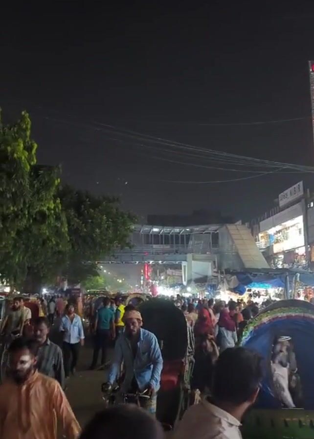 The scene depicts a densely populated street at night, possibly a market or gathering place in an urban setting. Numerous people are walking around, dressed in a variety of clothing. Several rickshaws are present, with drivers navigating through the crowd. Buildings with lit signs are visible in the background, along with a pedestrian overpass. There are trees on the left side of the frame. The lighting is a mix of streetlights and the glow from nearby businesses.