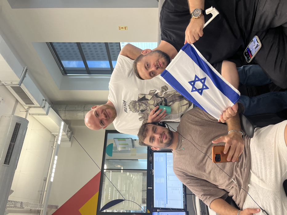 This image depicts three adult males posing in a modern office environment within the city of Bnei Brak, Israel
