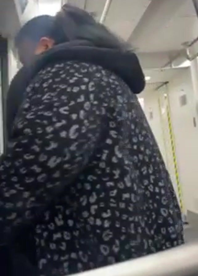 interior of a moving subway train. A woman in a dark, patterned jacket and blue shirt stands near a handrail. The train door opens, revealing the interior of another car, which is similarly white and mostly empty. The camera angle tilts.