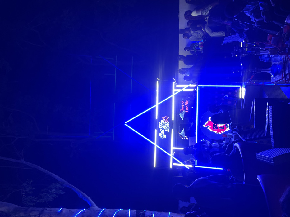 A nighttime scene reveals a gathering with blue and white neon lights defining the space. A triangular neon structure with "Get Me Lit" is prominent. A rectangle frames a Red Bull logo and the phrase "Time's Fir a this Flex." People sit at tables, silhouetted against the glow. In the background, shadowy figures stand along a wall, seemingly observing the event. A tree branch adorned with lights adds to the ambient atmosphere.