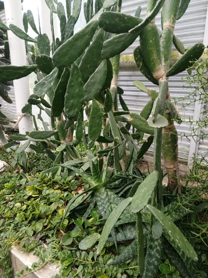 The image showcases a variety of green plants, predominantly cacti and succulents. Flat, oblong-shaped cactus pads dominate the scene, growing from taller, segmented stalks. Ground cover plants with small, round leaves fill the bottom left corner. An aloe plant with speckled leaves is situated amidst the cacti and ground cover. A metal structure is faintly visible in the background, possibly indicating a greenhouse setting.