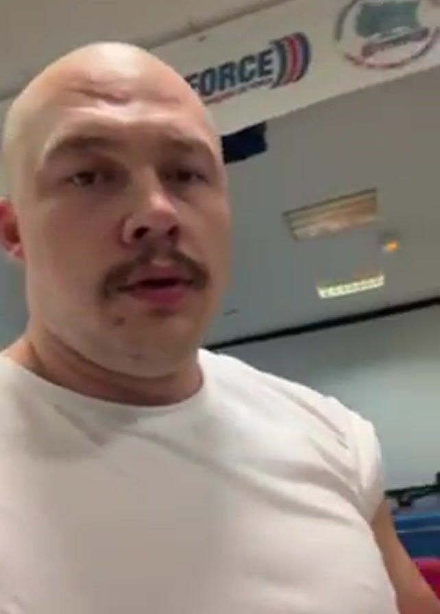 A bald man with a mustache is in a room, flexing his arm towards the camera