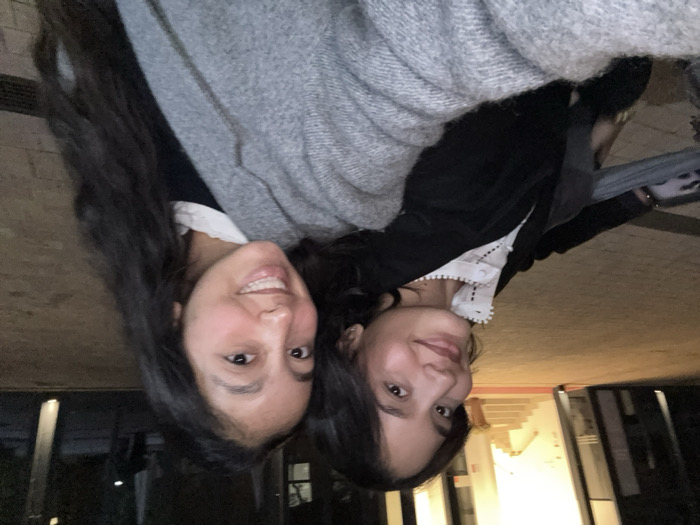 Two women pose closely for a photo, seemingly outdoors at night. One wears a gray sweater, while the other is in a black jacket with a white collar. Both have long, dark hair and are smiling. The background is somewhat blurred, showing a building with windows and some outdoor paving. The image is oriented sideways.