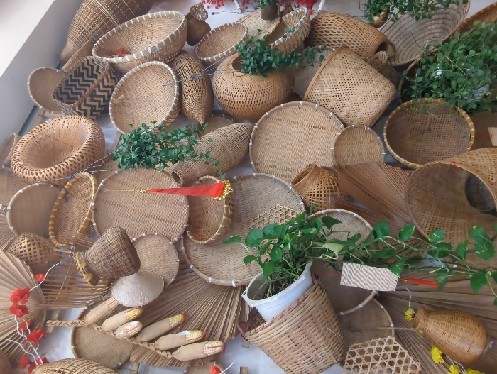 - "The image displays an indoor wall decorated with a dense, overlapping arrangement of numerous hand-woven items, located in Thủ Đức, Vietnam" by FM-TJyEH3, licensed under CC BY 4.0