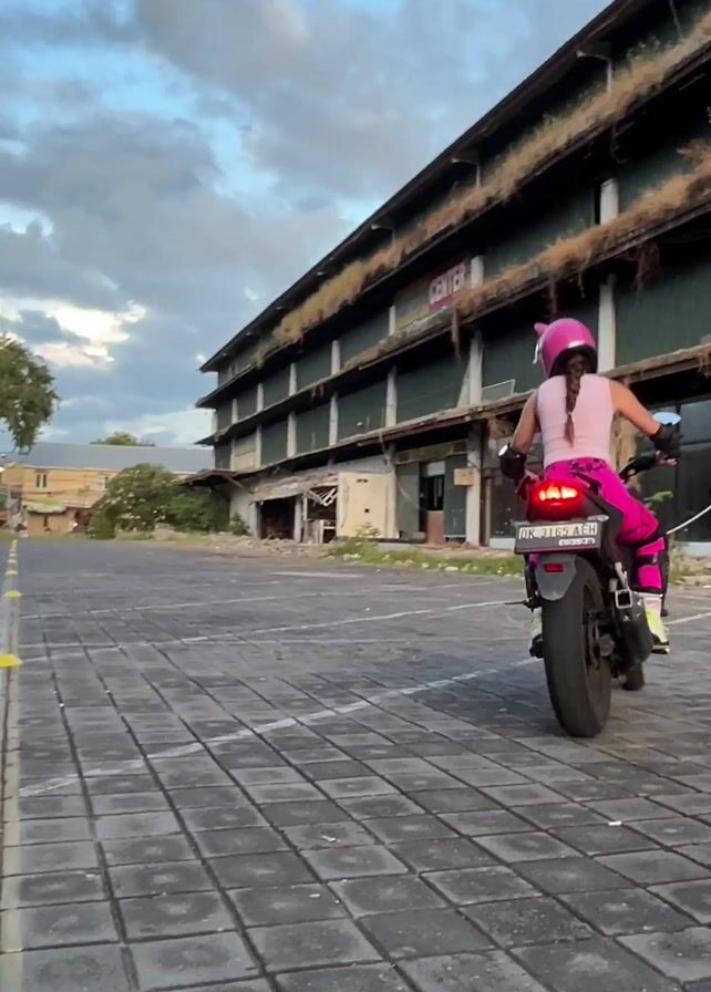 A woman wearing a pink cat-eared helmet, a light pink top, bright pink pants, and white sneakers is riding a black motorcycle on a grey brick-paved lot. She's riding away from the camera and veering slightly to the right. Behind her is a large, multi-story building with faded signage reading "Hardy's CENTER." The building appears worn and possibly abandoned, with vegetation growing on the upper floors. In the background, a few other buildings and trees can be seen under a cloudy sky. Yellow traffic cones are placed intermittently along white lines painted on the pavement.