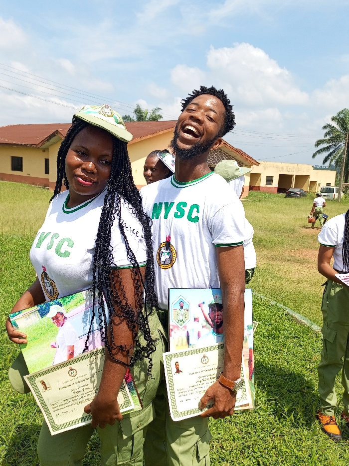 The image displays an outdoor scene in Aramoko-Ekiti, Nigeria, under a clear blue sky with scattered white clouds. In the foreground, a young adult female and male stand side-by-side, both with dark complexions, facing the viewer. Both wear white t-shirts with green trim around the collar and sleeves, emblazoned with "NYSC" in green and the National Youth Service Corps emblem below it, paired with olive green trousers. The female, on the left, has long dark braided hair and a light green NYSC cap perched on her head; she holds a framed portrait of herself in uniform and a "Certificate of National Service," displaying a slight smile. The male, on the right, has short dark hair and a beard; he holds a similar framed portrait of himself and a "Certificate of National Service," exhibiting a wide, open-mouthed laugh. A brown wrist-watch is visible on his left wrist. In the midground, several other individuals, some also in NYSC attire, are partially visible. The background features a large grassy field, two single-story buildings (one with a reddish-brown roof, the other yellow-cream colored with a darker roof), and several palm trees and other green foliage. A dark-colored car and a white van are partially visible between the buildings. Overhead power lines traverse the upper portion of the frame.