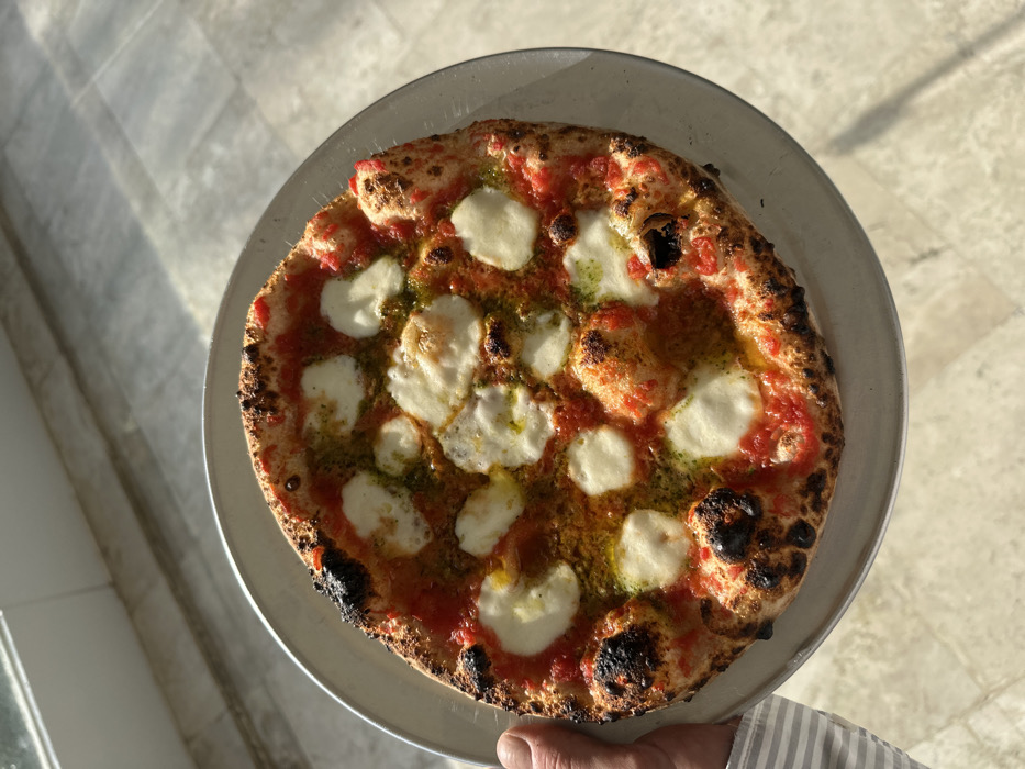 A round pizza, approximately 30-35 cm in diameter, is presented on a circular silver-toned metal pizza pan. The pizza features a visibly charred, raised crust with an uneven, bubbly texture. The toppings include a bright red tomato sauce base, irregularly distributed melted white fresh mozzarella cheese, and scattered green pesto or herb oil drizzles, along with visible olive oil sheen. The pizza is held by a hand, visible on the lower left, gripping the edge of the metal pan. The hand's wrist shows the cuff of a light-colored, possibly striped, long-sleeved garment. The background consists of a light-toned, possibly tiled or stone, floor surface illuminated by direct sunlight, creating sharp shadow patterns, suggesting an indoor space with prominent natural light, located in Interlomas, Mexico.