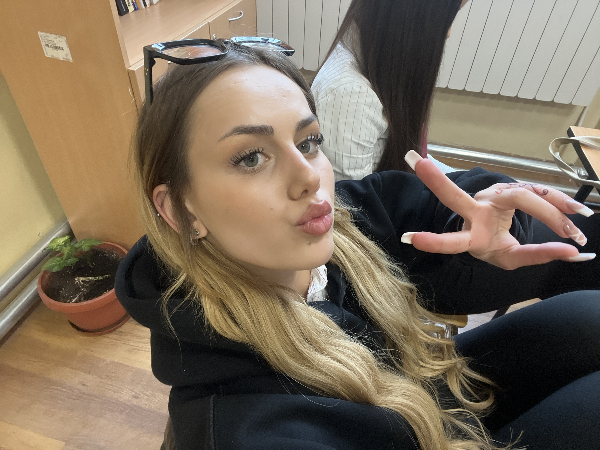 A woman poses for a selfie, seated indoors with a potted plant visible to her left. She is fair-skinned with light brown and blonde hair, and wears a black hooded sweatshirt. Her lips are pursed in a kiss, and she holds her right hand up, displaying long fingernails with white tips. The hand features small, faint tattoo designs. Eyeglasses are perched atop her head. Behind her, another woman with long, dark hair sits, wearing a white striped shirt. A radiator can be seen on the wall behind the women. A portion of a wooden desk is visible to the right. The location within the city of Ruse, Bulgaria, cannot be determined from the provided image.