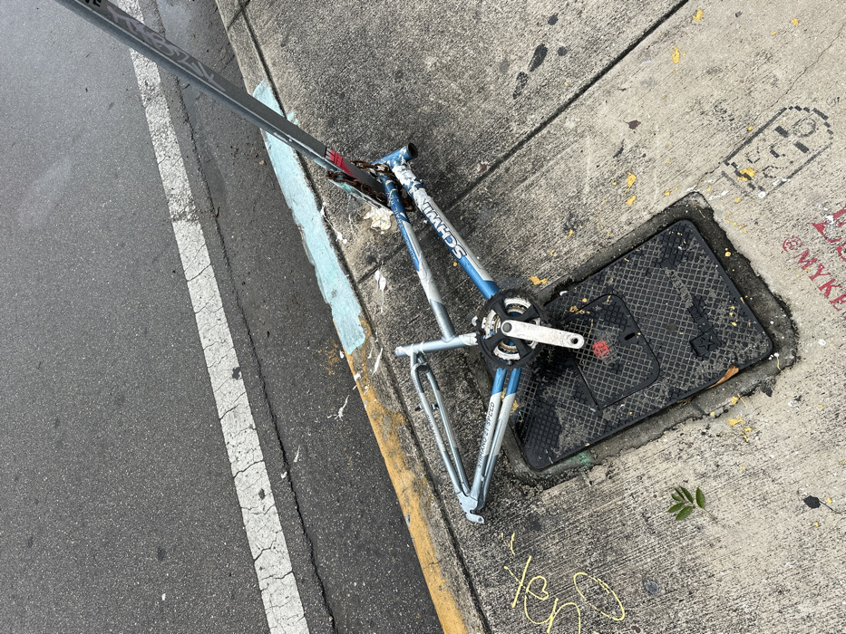 - "The image depicts a vandalized and stripped bicycle frame on a concrete sidewalk in the city of Miami, United States" by FM-IS41v2, licensed under CC BY 4.0