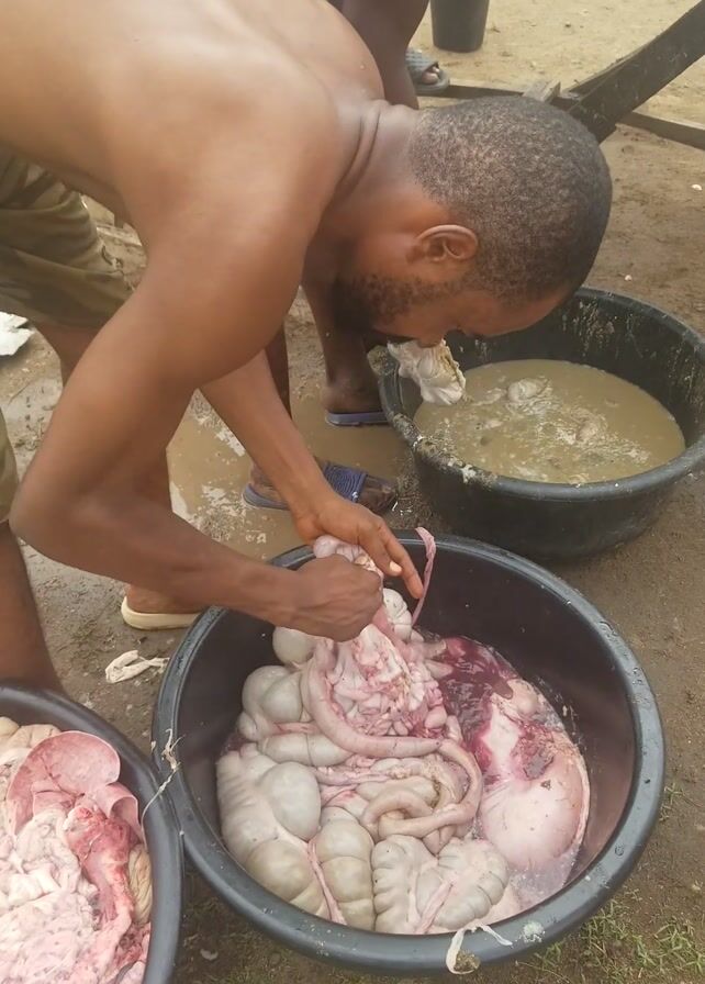 A shirtless man is squatting, cleaning animal intestines. He is wearing blue and white sandals. He is using his hands to manipulate the intestines, which are in a black bucket filled with water and blood. There are two additional black buckets visible, one with a milky liquid and another with other animal parts. Another person's legs are visible on the left edge of the frame. The scene appears to be outdoors on a dirt surface with grass.