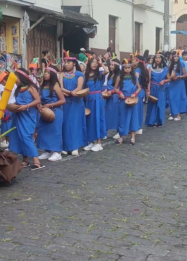 parade taking place on a cobblestone street lined with buildings. A group of young girls dressed in blue robes and white sneakers are walking in a line, each holding a wooden bowl. They are wearing headbands adorned with colorful decorations. Some of the girls are looking straight ahead, while others are looking to the side. They are walking behind a large decorative display featuring a tall yellow bamboo pole and what appears to be a plant or tree stump wrapped in brown fabric. Other people are walking behind the girls, some wearing light blue shirts and carrying white balloons. Buildings are visible on either side of the street, with shops and apartments. The weather appears to be overcast. A sign that reads "A CRISTO REY" is visible on one of the buildings.