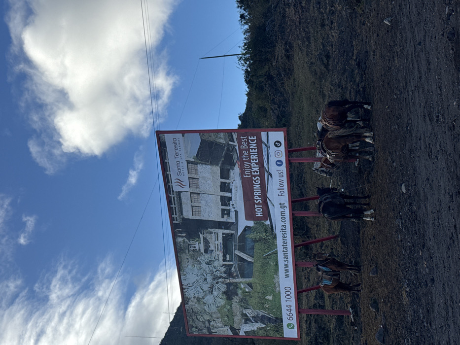 The image displays an outdoor scene in San Vicente Pacaya, Guatemala, dominated by a large billboard and a group of horses