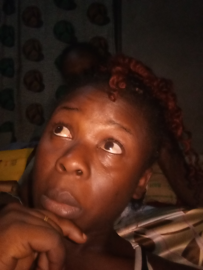A woman with dark skin and red curly hair looks upwards with a thoughtful expression. Her right hand, adorned with a gold ring, supports her chin. A patterned curtain is visible in the dim background. The overall lighting in the picture is subdued, creating a sense of intimacy. She appears to be lying down on a bed.