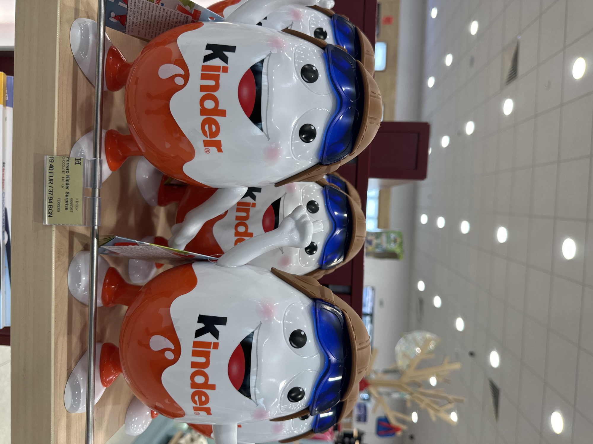 - "shelf in a store, displaying multiple Kinder Surprise chocolate eggs in decorative, character-shaped packaging" by FM-hAbta2, licensed under CC BY 4.0